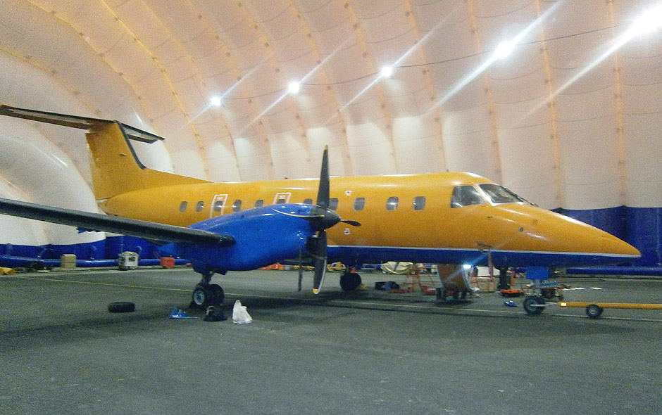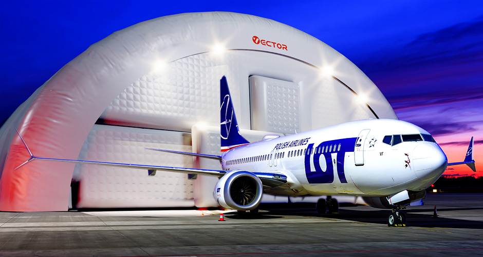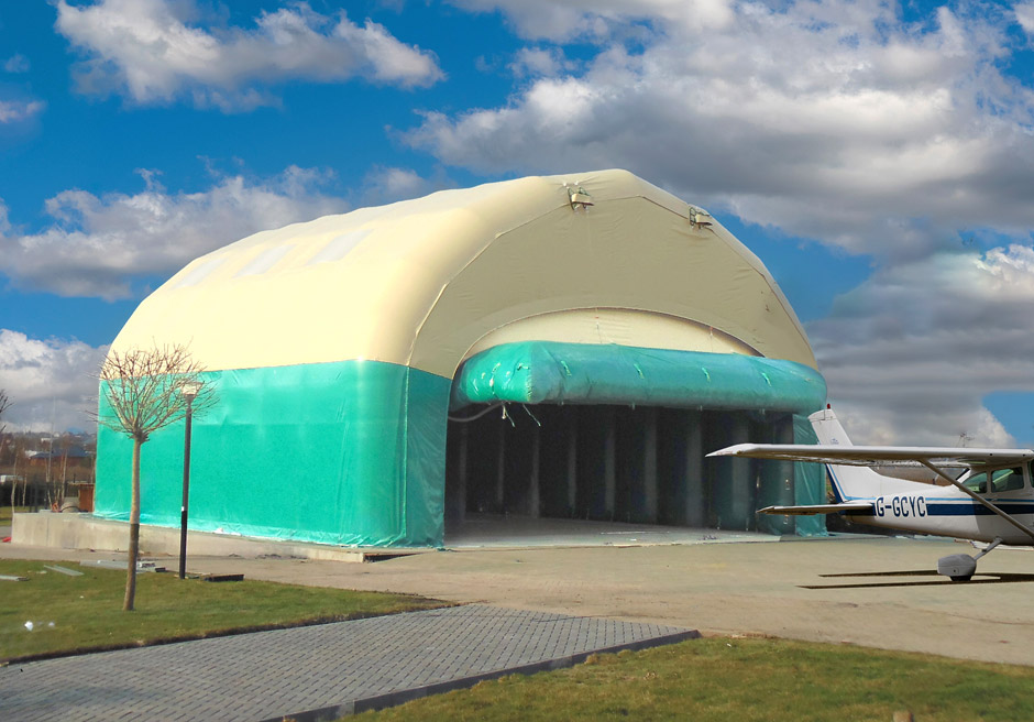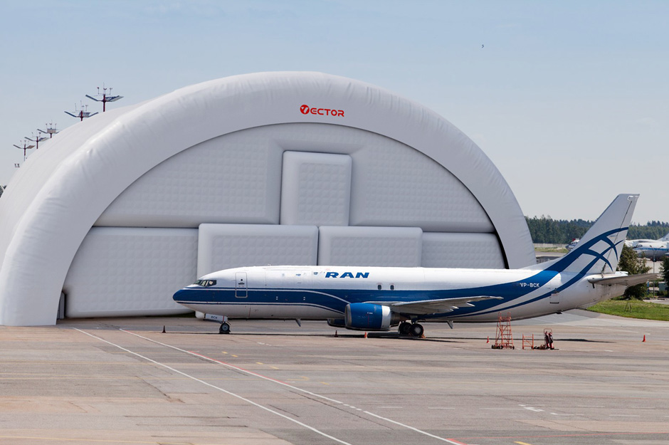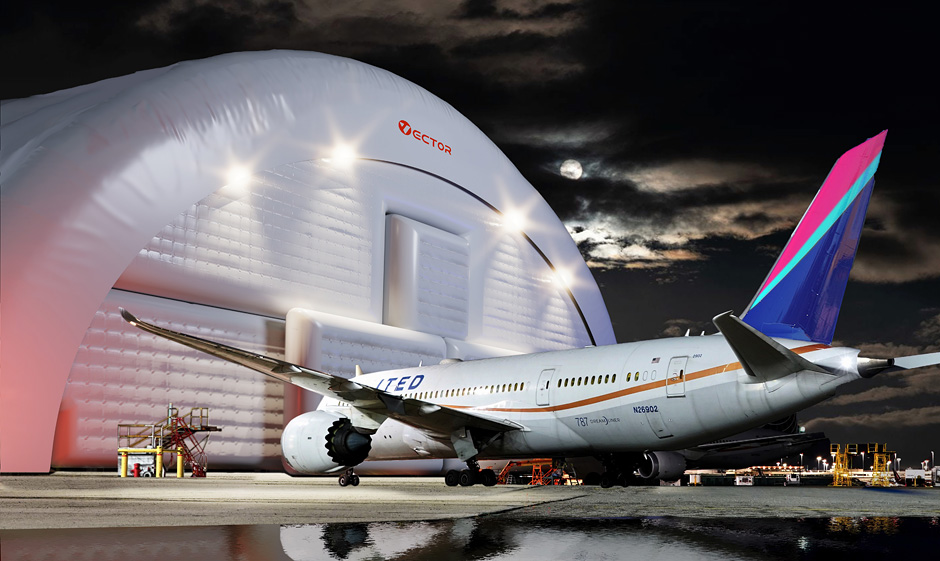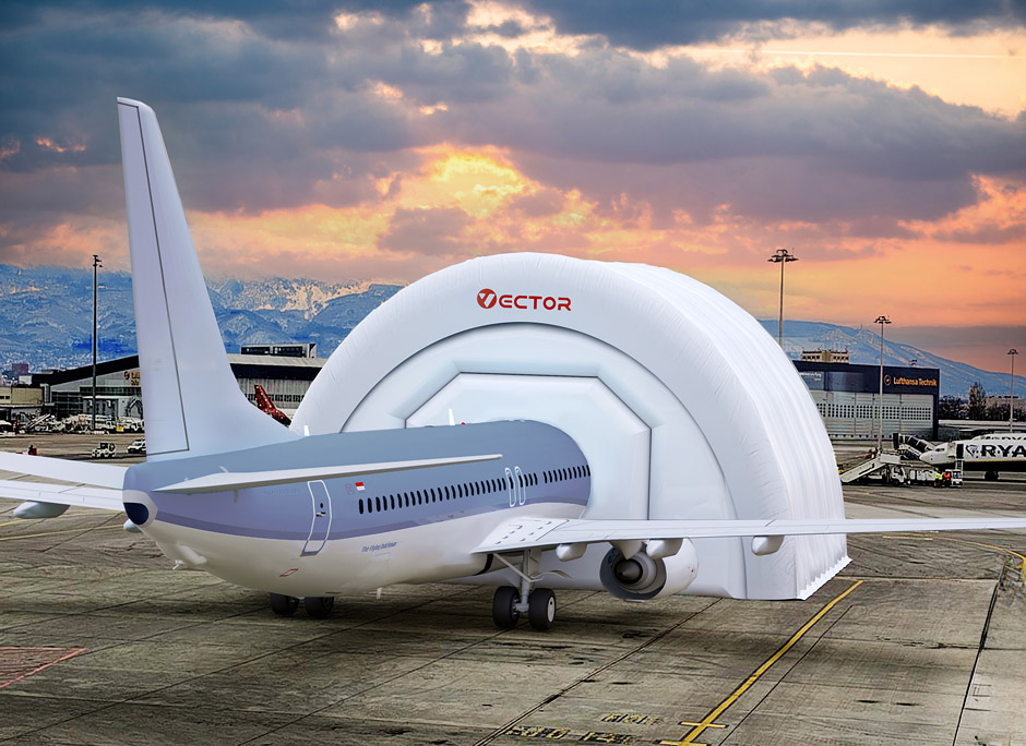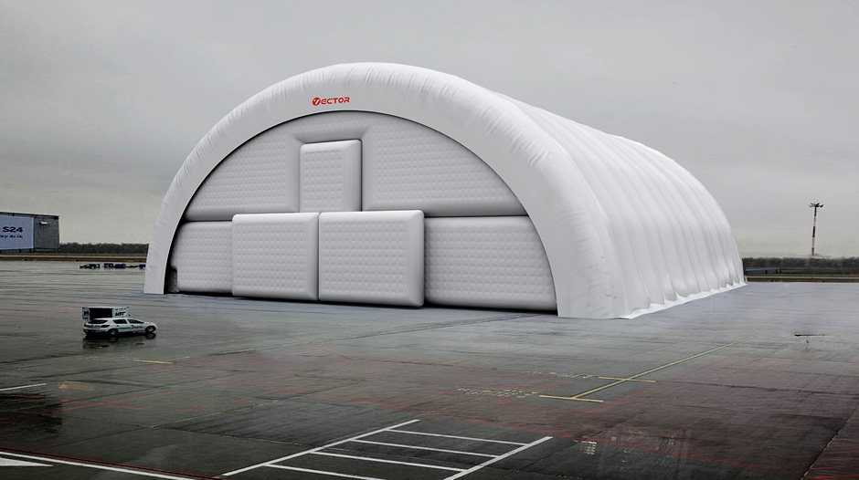 Vector inflatable aircraft hangars can be used as temporary or long-term structures for aircraft storage, inspection, repair, and weather protection.