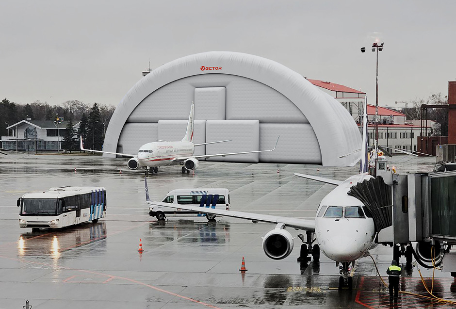 The advantages of inflatable aircraft hangars are fast production, rapid deployment, and minimal heavy equipment during installation. The sealed inflatable modules are filled with compressed air, giving the building rigidity and allowing it to withstand wind and snow loads. Vector temporary airplane hangar systems are adapted for operation in different climate zones within the temperature range from -22°F to +104°F.
