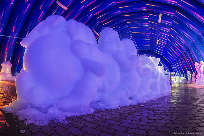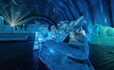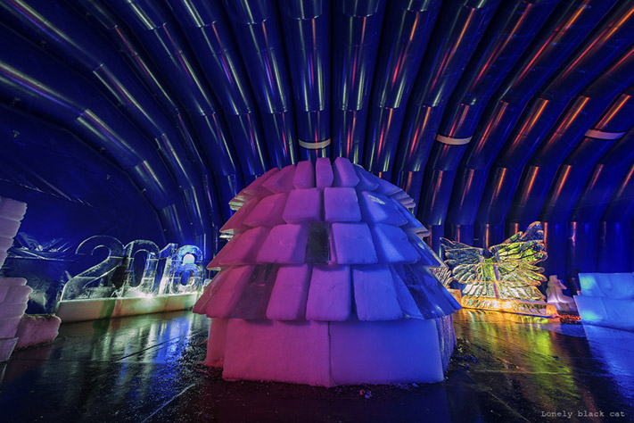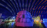 Project features: specialists of the Vector company had the task to create a dark space inside the pavilion. Therefore, the inflatable frame was made of a blackout fabric. Due to the 7-foot thick walls, the building holds the desired indoor temperature, which satisfied an essential condition for the functioning of the exhibition of ice sculptures.