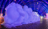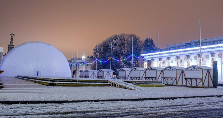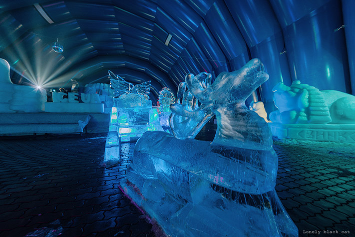 Project features: specialists of the Vector company had the task to create a dark space inside the pavilion. Therefore, the inflatable frame was made of a blackout fabric. Due to the 7-foot thick walls, the building holds the desired indoor temperature, which satisfied an essential condition for the functioning of the exhibition of ice sculptures.